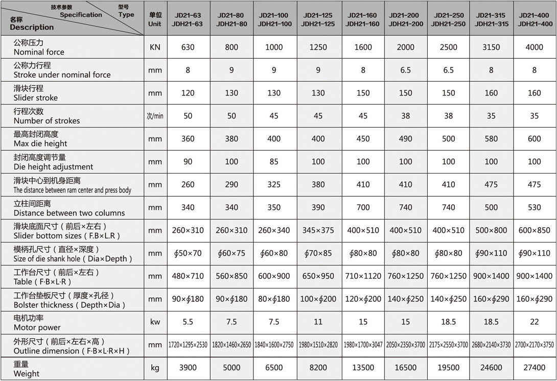 采用整體鑄鐵機(jī)身,不可傾斜,廣泛應(yīng)用于沖孔、落料、彎曲、淺拉伸、成型等冷沖壓工藝。
